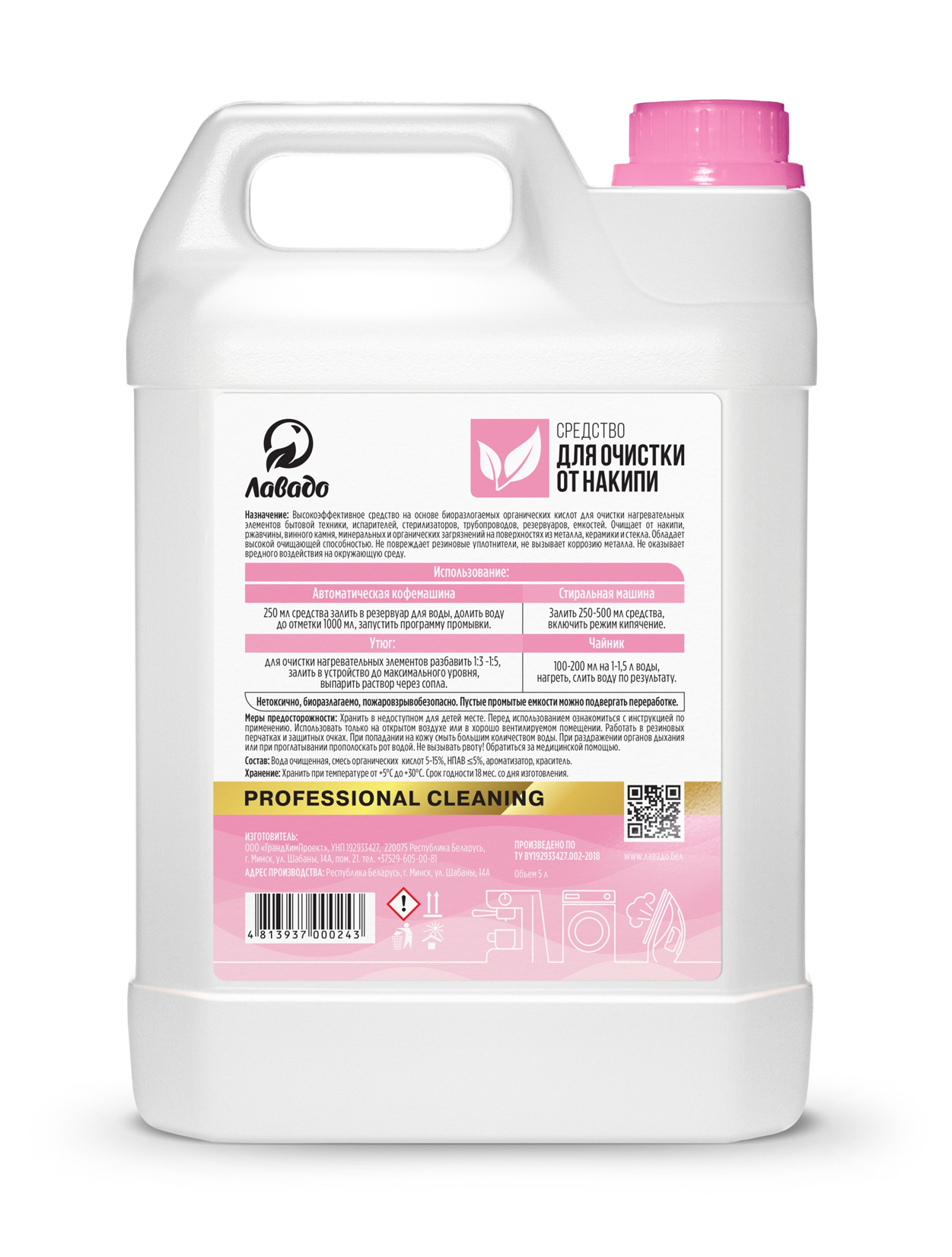 Высокоэффективное средство на основе биоразлогаемых органических кислот для очистки нагревательных элементов бытовой техники, испарителей, стерилизаторов, трубопроводов, резервуаров, емкостей. Очищает от накипи, ржавчины, винного камня, минеральных и органических загрязнений на поверхностях из металла, керамики и стекла. Обладает высокой очищающей способностью. Не повреждает резиновые уплотнители, не вызывает коррозию металла. Не оказывает вредного воздействия на окружающую среду.