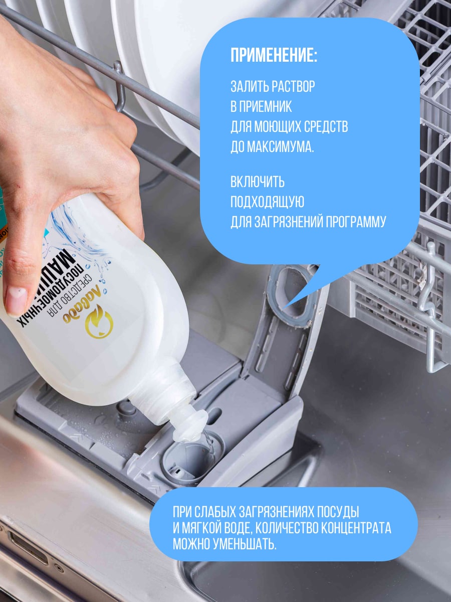 Для бытовых машин: залить в резервуар для моющего залить раствор в приемник до максимума, включить подходящую для загрязнений программу. При слабых загрязнениях и мягкой воде количество концентрата можно уменьшить. Для достижения ожидаемого результата помимо моющего средства, ППМ должна быть заправлена солью и залит ополаскиватель.